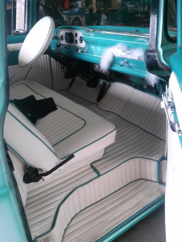 The rear of the wagon received a custom tuck n’ roll padding for comfortable sitting while enjoying a picnic or catching a movie at the drive-in.